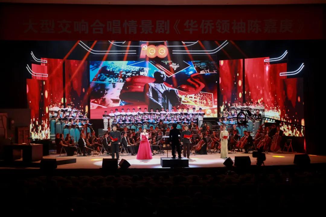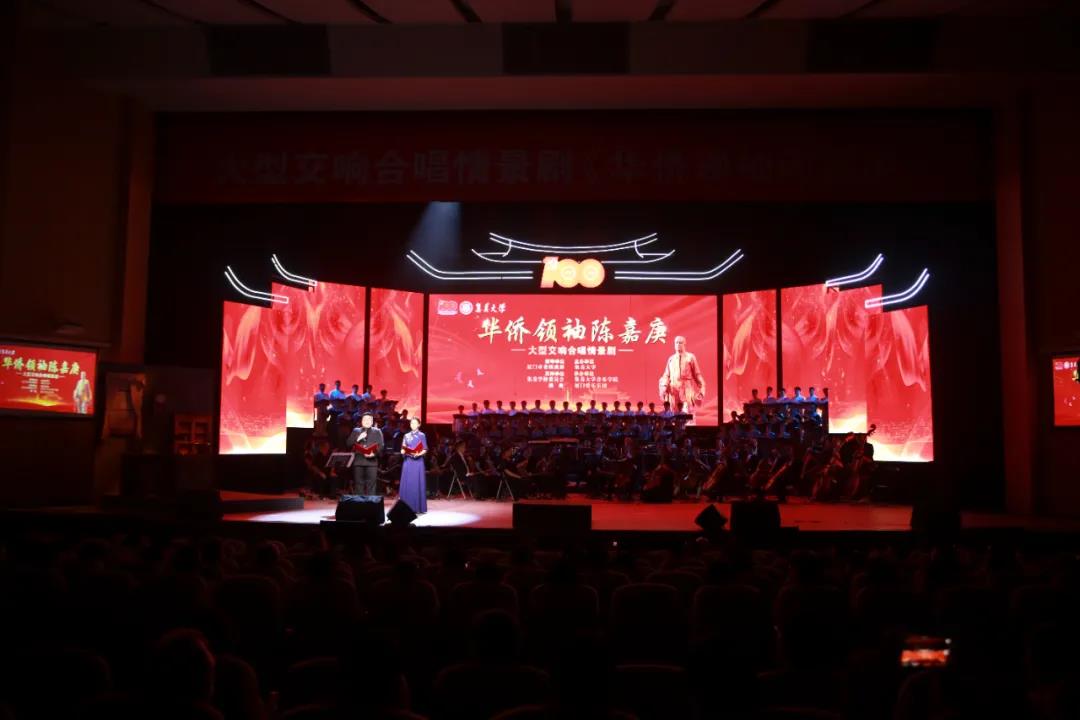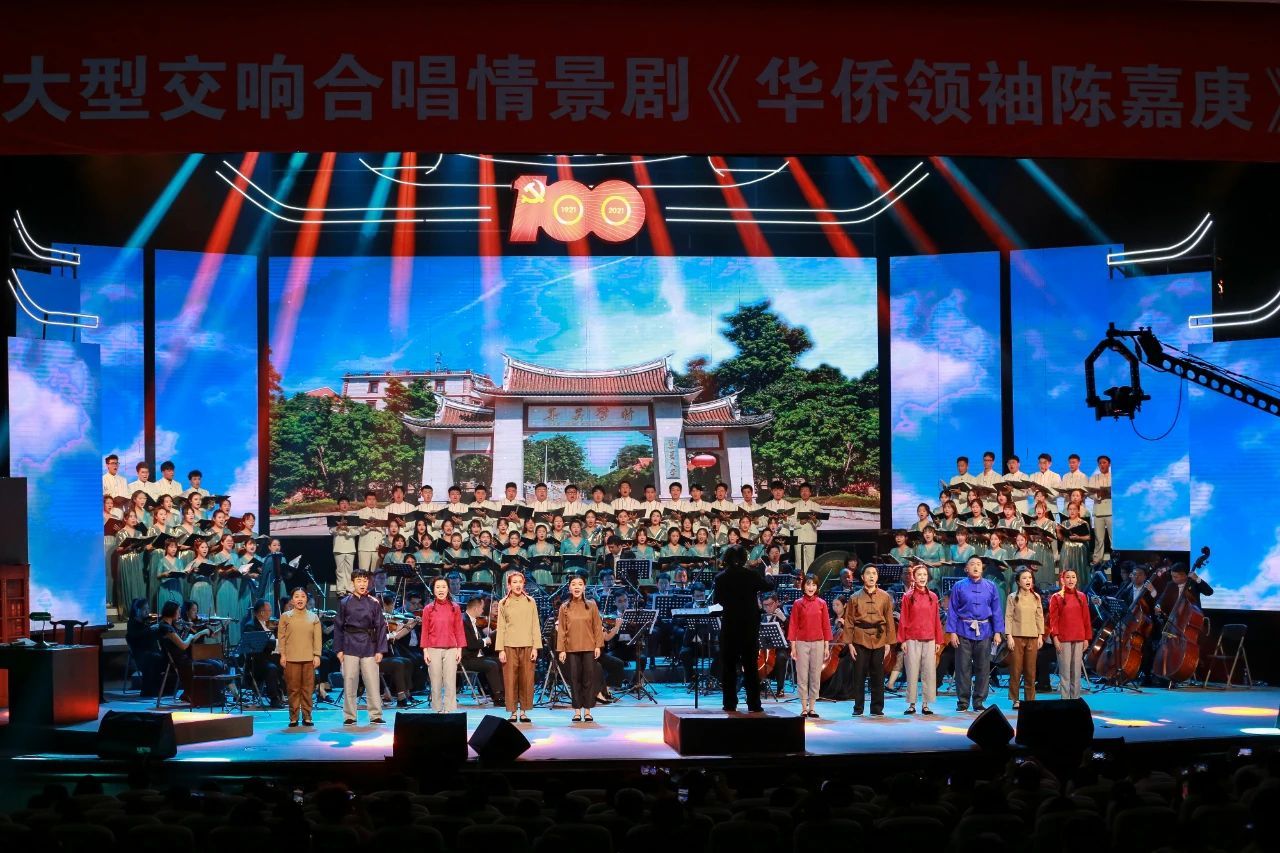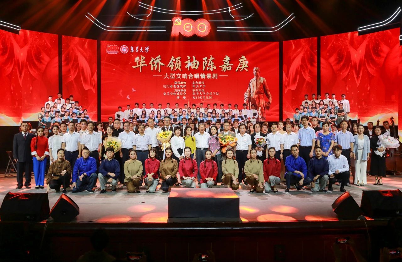 7月9日晚,集美大学《华侨领袖陈嘉庚》大型交响合唱情景剧在诚毅影剧院首演。这部由集大师生、校友历时一年时间,精心打造的大型交响合唱情景剧回望了中国共产党团结带领中国人民浴血奋战、淬火成钢的伟大历程,这也是我校第一次以音乐剧目的形式呈现嘉庚先生的生平事迹。