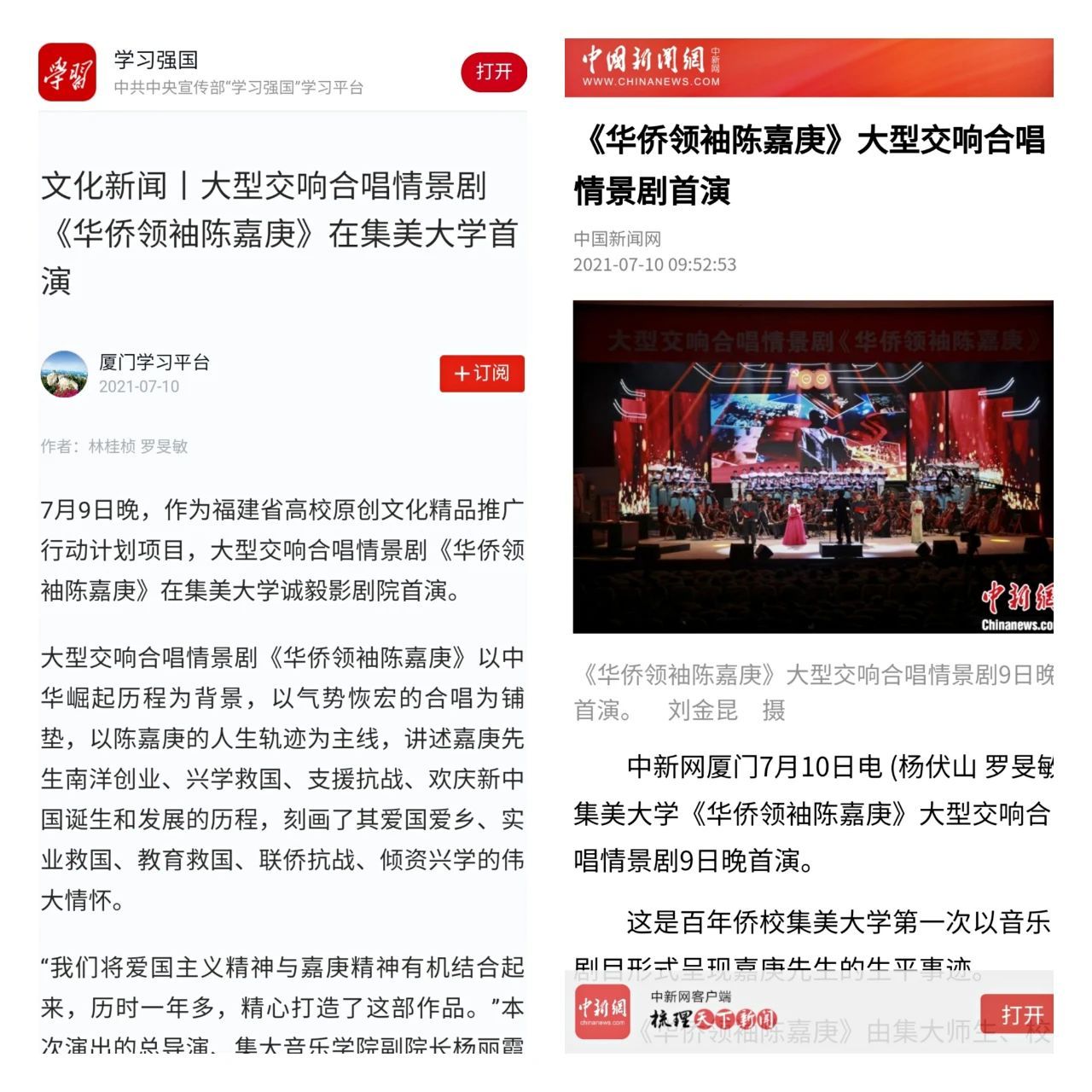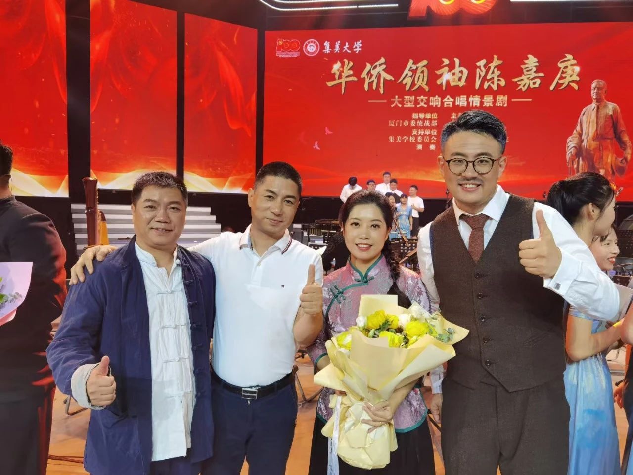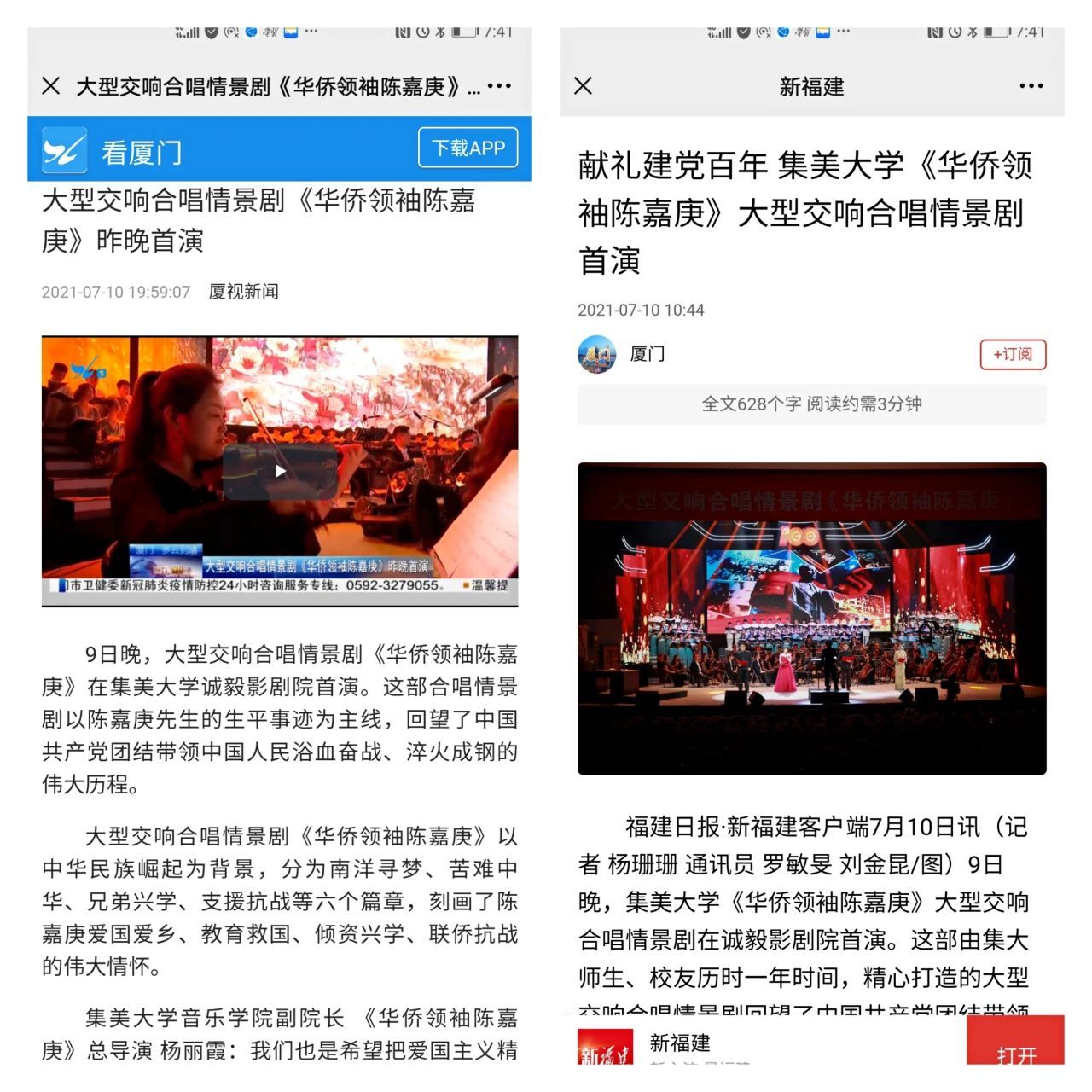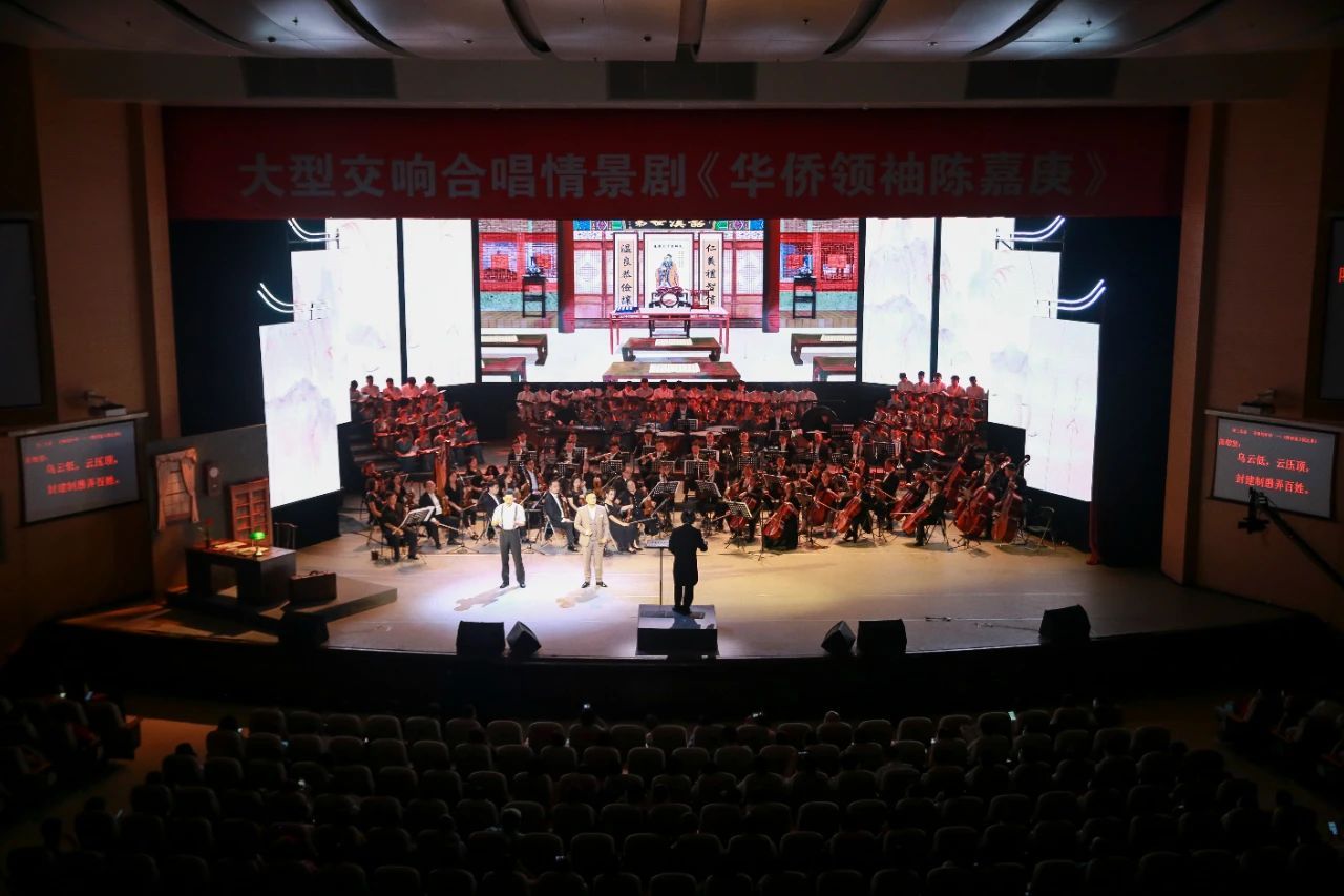 7月9日晚,集美大学《华侨领袖陈嘉庚》大型交响合唱情景剧在诚毅影剧院首演。这部由集大师生、校友历时一年时间,精心打造的大型交响合唱情景剧回望了中国共产党团结带领中国人民浴血奋战、淬火成钢的伟大历程,这也是我校第一次以音乐剧目的形式呈现嘉庚先生的生平事迹。