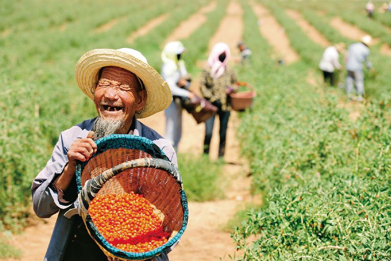 闽宁两省区成功实现了援助式扶贫向开发式扶贫转变。福建的人才、资金、技术、市场等要素与宁夏贫困地区的土地、特色农产品和劳动力资源有机结合,带动了当地现代农业和特色优势产业的发展。一个个特色优势产业集群正在改变着西海固落后的生产结构和传统的生活方式。图为2018年9月19日,同心县农民种植的枸杞喜获丰收。 宁夏区委宣传部供图 李君杰/摄