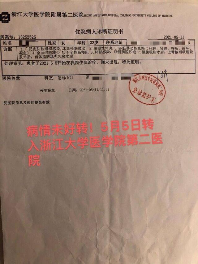 “我女儿5月2日到华颜医疗美容医院手术,术后感染休克,送到杭州绿城医院抢救,一天后转院至浙大医学院附属第二医院ICU,出现器官衰竭,后来靠呼吸机维持。”戴某父亲戴先生告诉澎湃新闻(www.thepaper.cn),女儿在杭州经营两家服装企业,平时对身材、样貌比较重视,花费5万余元在华颜医疗美容医院抽脂。事发后,华颜医疗美容医院相关负责人曾表示“先抢救,会承担医药费”,支付了80多万元医药费,6月下旬中断支付。6月18日,澎湃新闻曾联系华颜医疗美容医院,当时该院正常营业,工作人员在电话中表示对戴女士的事故“不知道这个事”。