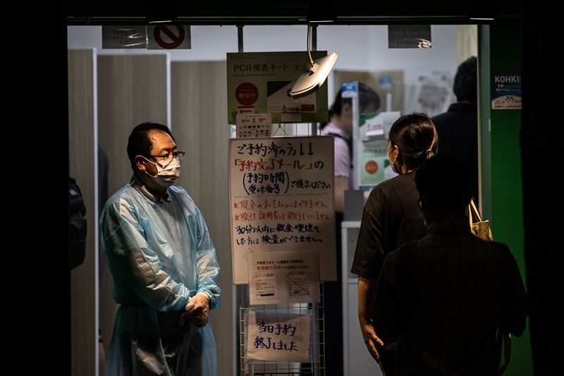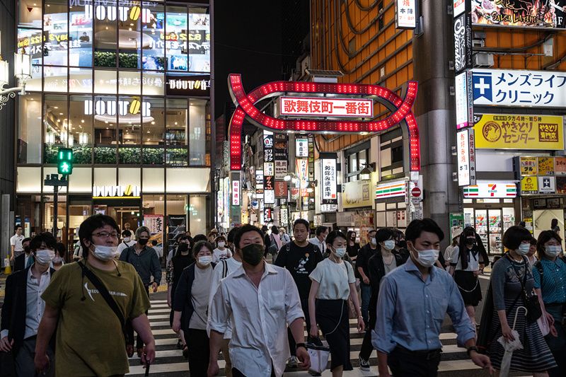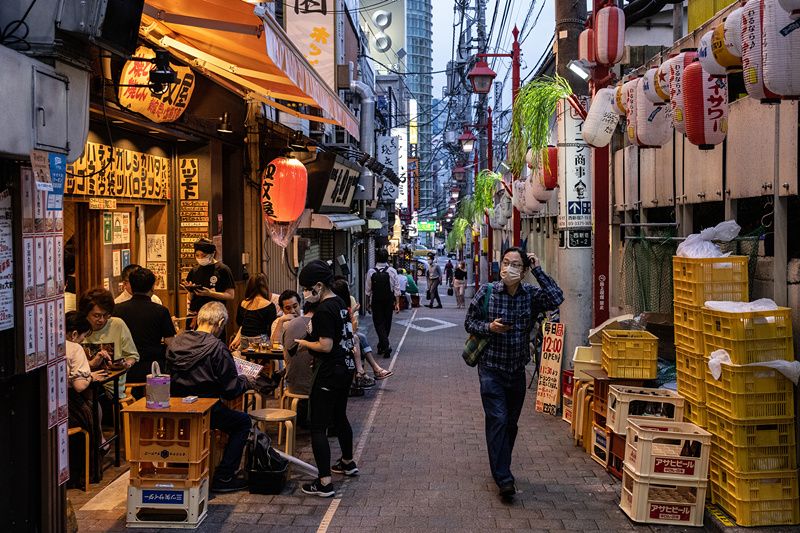当地时间2021年7月14日,日本东京,新冠疫情形势日益严峻的东京的街头。距离东京奥运会开幕还有9天,日本政府为防疫而实施的第四次紧急状态,通常熙熙攘攘的酒吧和餐馆被迫提前关门,并且不提供酒精饮料。