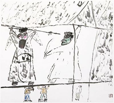 韩羽与白石老人的相通不是绘画题材、表现方式或者样式的相同,是精神上、看法上的。白石老人花鸟、人物、山水都涉猎,韩羽则侧重人物,其中又以戏曲人物见长。白石老人画作有南方的润泽,韩羽则多北方乡间的尘土。两人都创新,白石老人是站在传统绘画角度的突破,韩羽则多了现代意识的自觉,如黄苗子所言“土极而洋到了家”,也似张仃的“毕加索加城隍庙”。