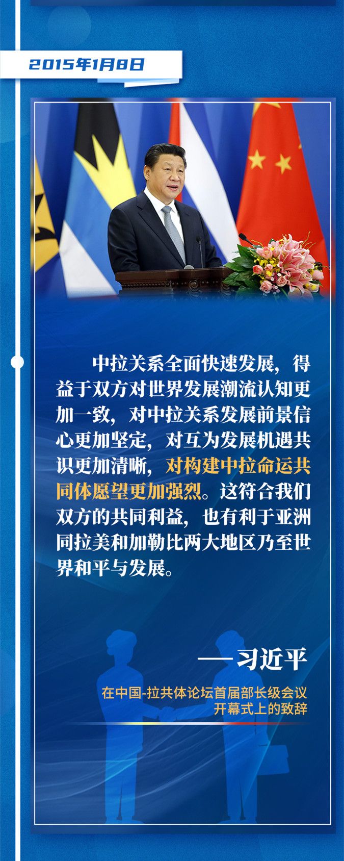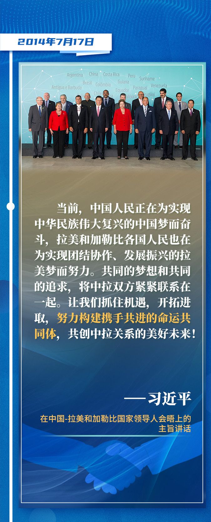 7年前,国家主席习近平在巴西利亚出席中拉领导人首次会晤时提出,中拉要努力构建携手共进的命运共同体,为进一步发展中拉全面合作伙伴关系指明了方向。