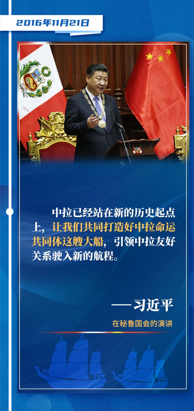 2016年11月21日,在秘鲁国会,习近平主席将中拉命运共同体比作一艘大船,呼吁双方高举和平发展合作旗帜、推动发展战略对接、推进合作换挡加速、实现合作成果共享。