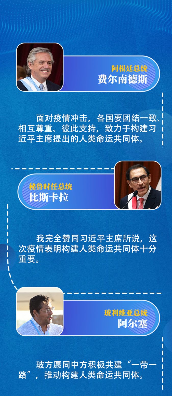 尤其在新冠疫情期间,习近平主席同拉美多国领导人互致函电,引领中拉同心抗疫、共谋发展,以实际行动生动诠释“天涯若比邻”,丰富了中拉命运共同体理念内涵。