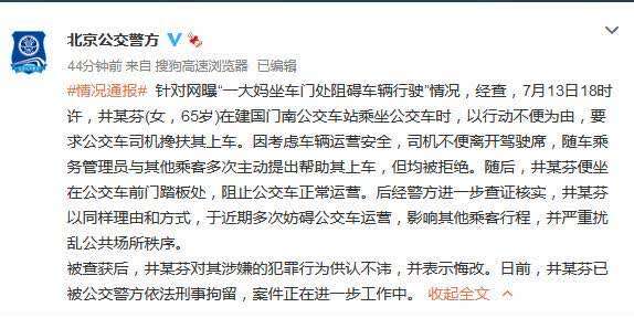 中新网7月18日电 据北京市公安局公共交通安全保卫分局官方微博消息,针对网曝“一大妈坐车门处阻碍车辆行驶”情况,经查,井某芬于近期多次妨碍公交车运营,其对涉嫌的犯罪行为供认不讳。日前,井某芬已被公交警方依法刑事拘留。