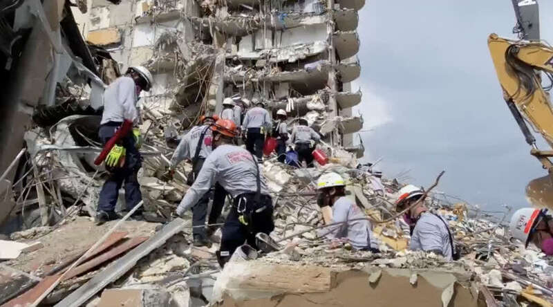 这张当地消防局6月25日发布的视频画面截图显示,救援人员在美国佛罗里达州迈阿密-戴德县发生局部坍塌的一栋住宅楼废墟上搜救。新华社发(佛罗里达州迈阿密-戴德县消防局供图)