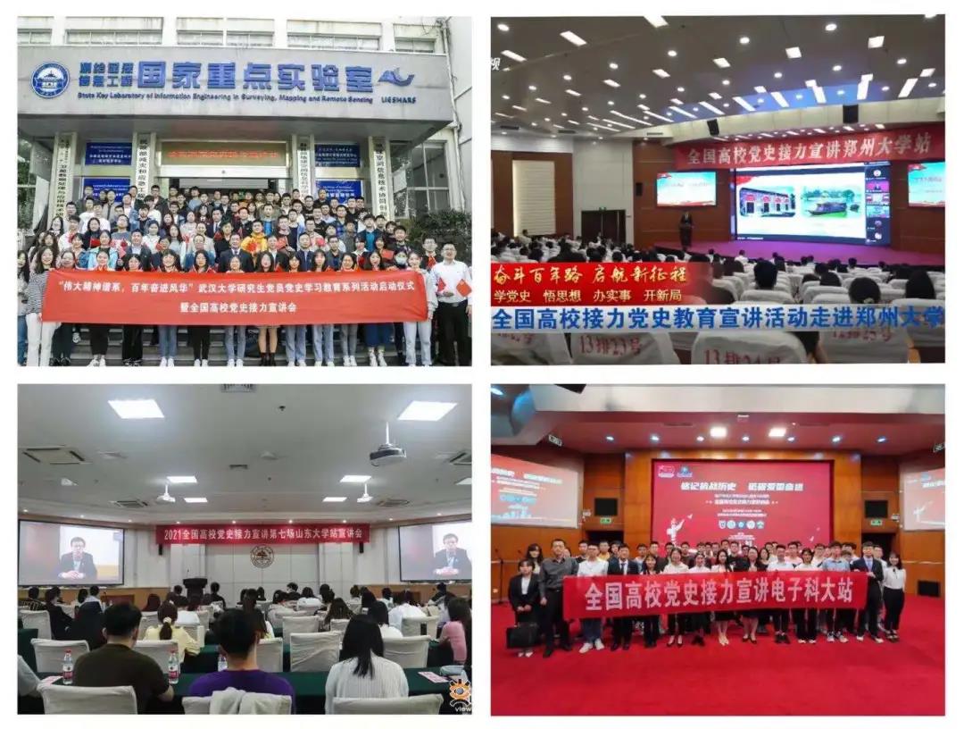 12场高校党史接力宣讲分别在清华大学、武汉大学、浙江大学、华中科技大学、电子科技大学、郑州大学、山东大学、重庆大学、中国社会科学院大学、湖南大学、北京邮电大学、中国人民大学开展,近15万人次参与宣讲学习。