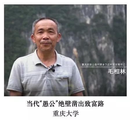 重庆巫山县竹贤乡下庄村坐落在一个巨大的天坑里,因为没有通往外界的公路,村民们祖祖辈辈生活在贫困中。20多年间,时任村党支部书记的毛相林带领乡亲们凭借顽强的毅力,在悬崖峭壁上“凿”出了一条脱贫致富路。