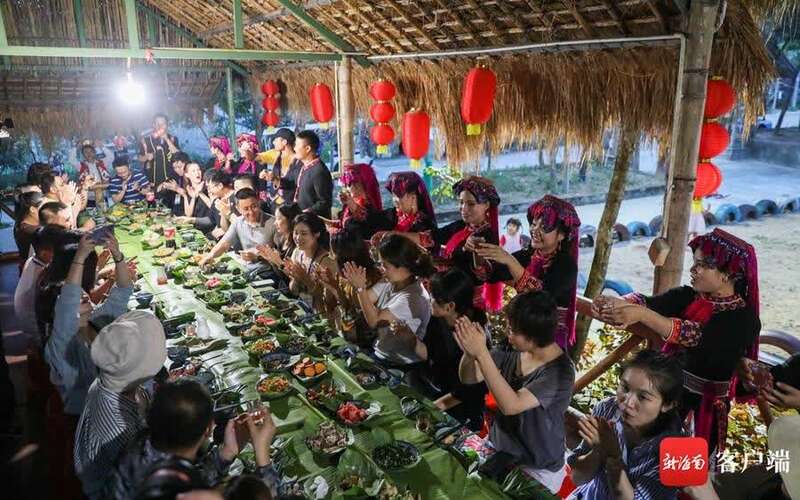 7月18日,全媒体采访团走进琼中什寒村,品尝长桌宴美食。记者 李昊 摄