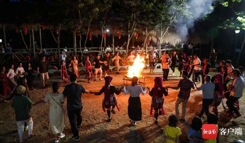 7月18日,全媒体采访团走进琼中什寒村,参加篝火晚会狂欢。记者 李昊 摄