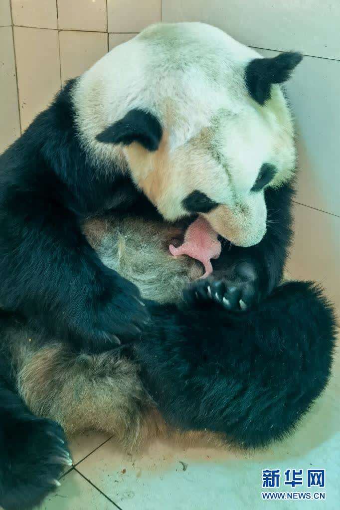 在中国大熊猫保护研究中心卧龙神树坪基地内,大熊猫“苏珊”在照顾幼仔(7月17日摄)。新华社发(中国大熊猫保护研究中心供图)