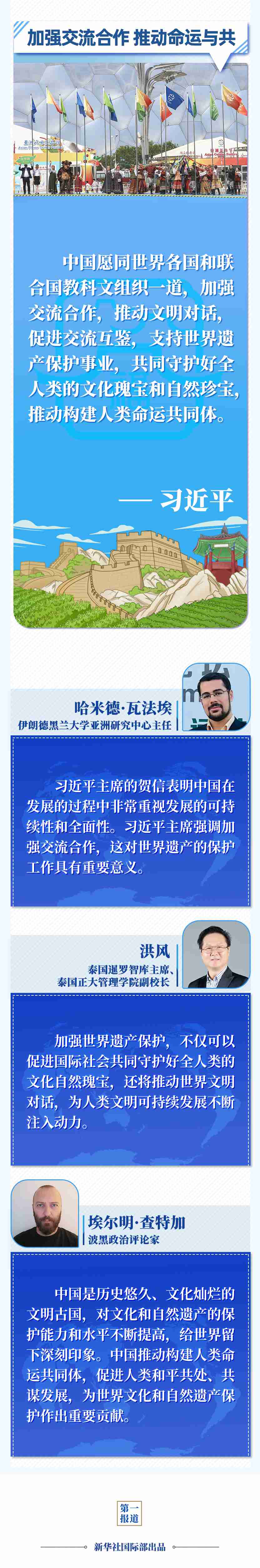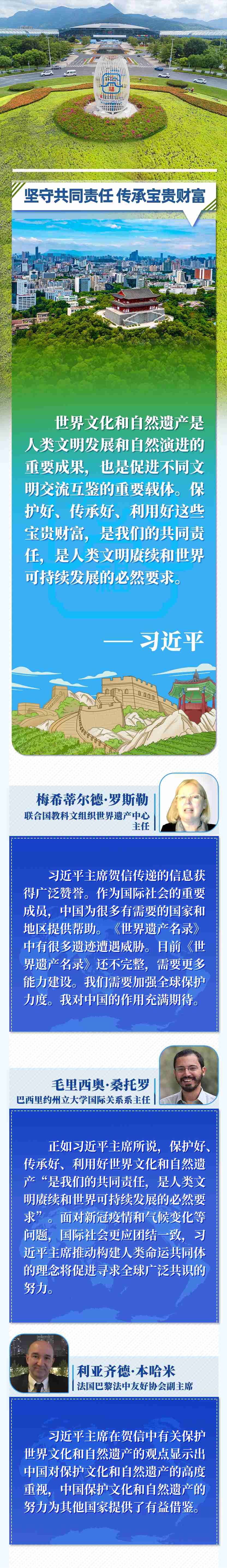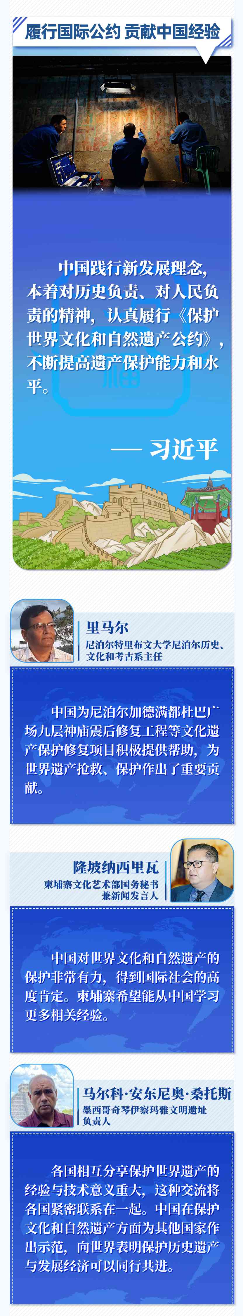 多国人士表示,中国对保护文化和自然遗产高度重视、作出巨大努力,为其他国家提供有益经验借鉴,为世界文化和自然遗产保护、推动世界文明对话等作出重要贡献。