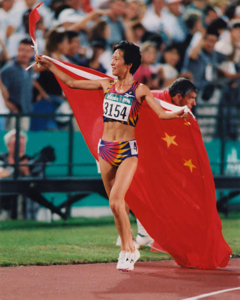 王军霞披着鲜艳的五星红旗