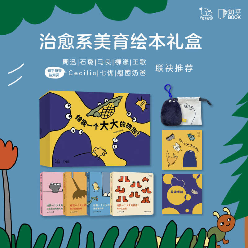 《给我一个大大的拥抱!》是知乎图书出版的第一套 0-4 岁儿童绘本。这是一套充满温暖与想象力的治愈系儿童美育绘本,共4册。绘本从小朋友的视角出发,讲述宝宝在认识世界中发生的暖心小故事:不认识的毛毛虫为什么要追我?长得像牙齿的脚丫是谁的呢?影子究竟是不是怪物?种蒜苗要多少天?在寻找答案的过程中,大大仔和他的朋友们认识了更大的世界,感受到了来自他人的美好与爱。
