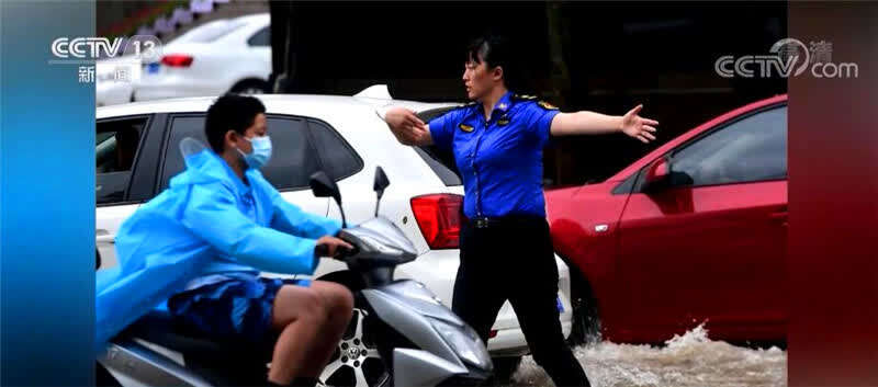 在郑州,暴雨后的街头一名穿着制服、全身湿透的政府工作人员,在花园路积水段引导车辆从浅水区通行。