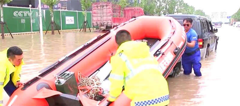在郑州东三环,此积水区域积水很深,从高空来看很是震撼,积水中有垃圾车被困在在水中,而很多私家车漂在水中只露个车顶。救援队人员积极解救被困人员,乘坐冲锋舟展开救人。