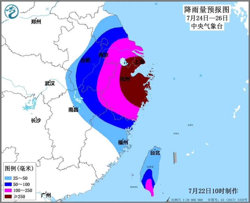 24日至26日,台湾岛南部、福建北部、浙江、上海、江苏中南部、安徽中南部、江西东北部等地有大到暴雨,其中浙江中东部、上海、江苏南部、安徽东南部等地部分地区有大暴雨,浙江东北部和上海等局地有特大暴雨;累计降雨量有60~120毫米,浙江、上海、江苏南部、安徽东南部等地150~300毫米,浙江东北部沿海局地可达500毫米左右;上述地区最大小时降雨量30~80毫米,局地可达100毫米左右。