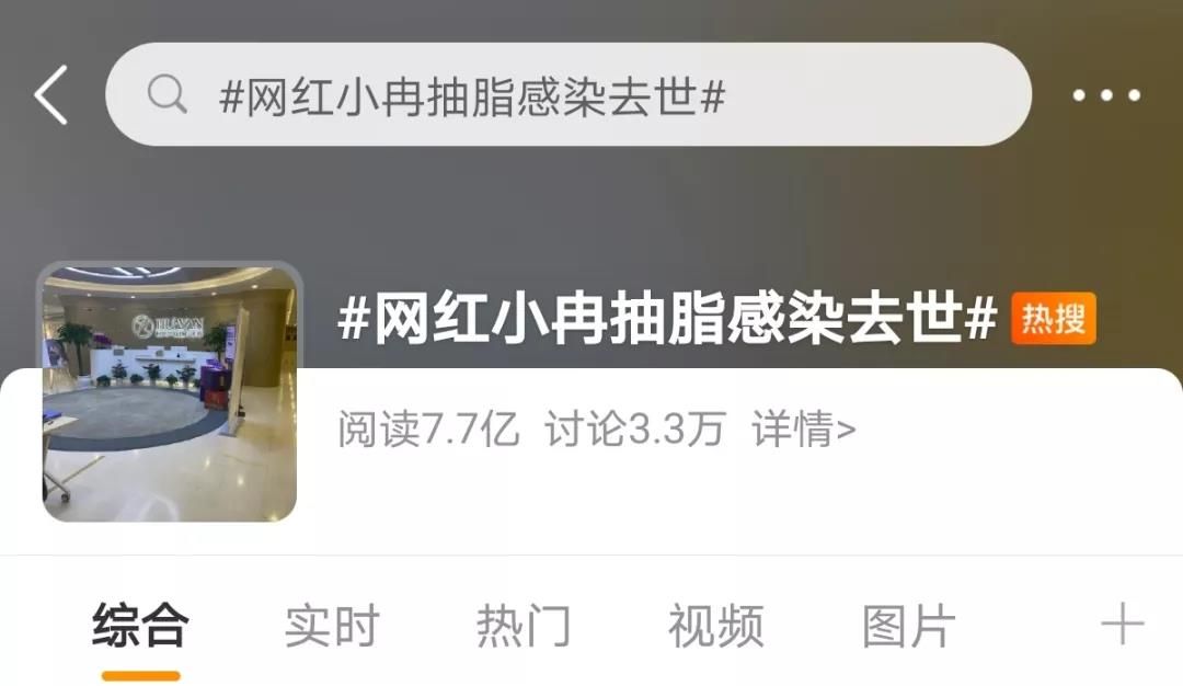 7月14日,网友通过@TimeMachine时光机爆料其好友小冉因做抽脂填充手术感染去世。消息爆出便冲上热搜,引起3.3万次讨论,阅读量达到7.7亿次。