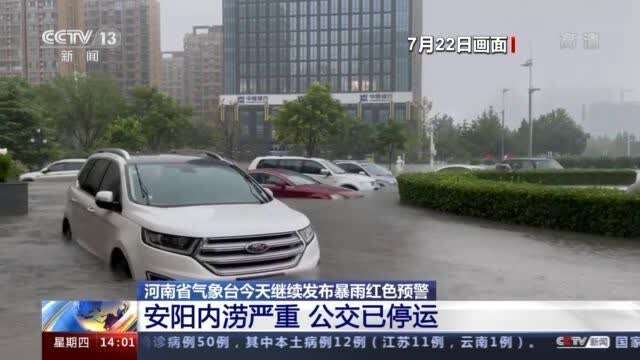 安阳市气象台今天继续发布暴雨红色预警,截至今天上午9点,安阳10小时累计降雨量超过600毫米,城市内涝严重。当地呼吁市民非必要不出门,居家办公,目前安阳市公交已停运。