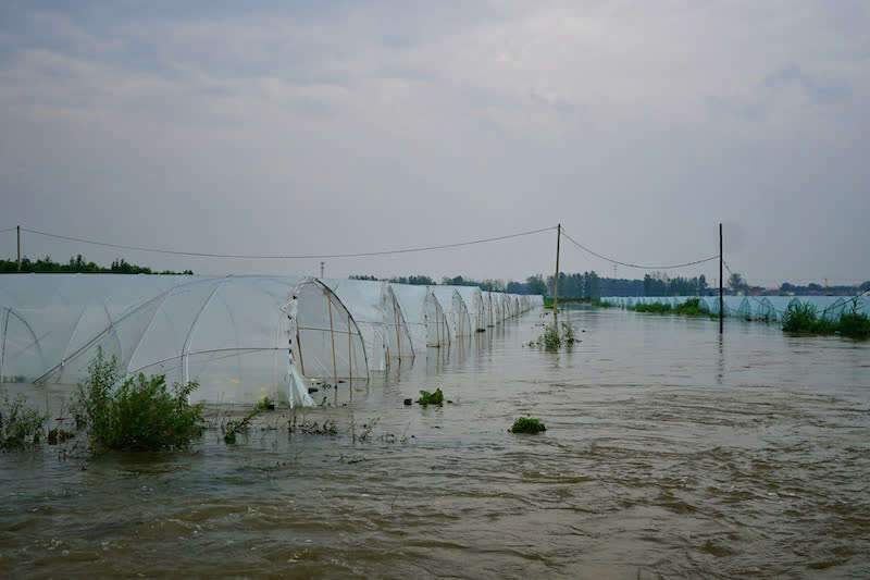 马刚是郑州市中牟县的一位农户,他主要经营禽类养殖和农作物种植生意。这些天,经过长时间的强降雨影响,他的农田里积水情况较为严重,大量农作物被淹,温室大棚内也充满积水。马刚告诉记者,他的农作物种植地附近没有排水渠,所以现在只能等积水慢慢渗透土壤。