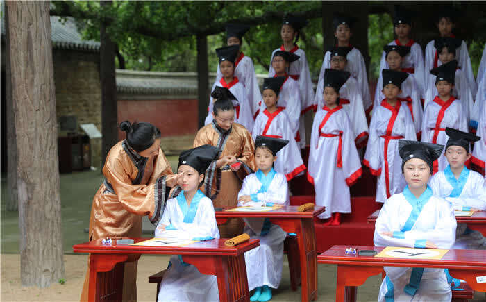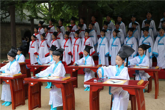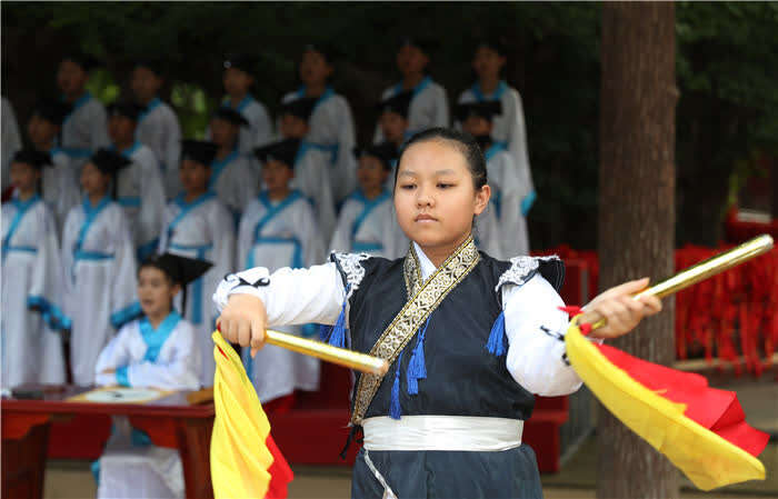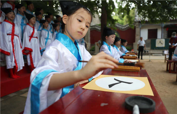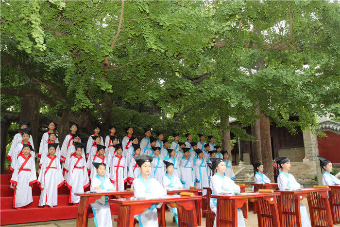 中国青年报客户端讯(张进刚 中青在线记者张胶)7月22日,在山东日照浮来山风景区四千年高龄的古银杏树下,莒县第二实验小学的孩子们,通过端正衣冠、朱砂开智、启蒙开笔、诵读经典诗文等环节,体验中国传统文化。