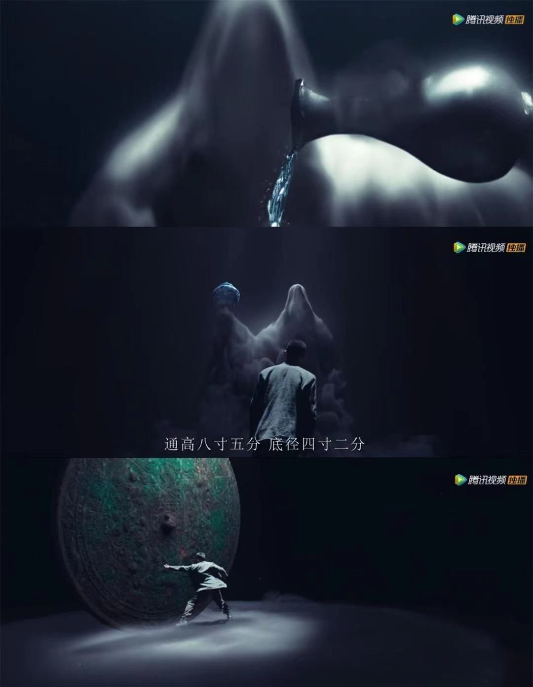 在鉴定一尊玉观音时,有点像是《河神》里的点烟辩冤,许一城进入一个幻境,观音手中的玉净瓶往许一城头上倒下瓢泼大水,许一城发现破绽;在鉴定一个青花瓷时,将青花瓷抛上空,许一城进入幻境,巨大的无脸烟雾观音手托青花瓷,青花瓷旋转,许一城娓娓道来其中玄机;在鉴定一块青铜时,则大量使用特效,让许一城与巨大的青铜器进行打斗,从青铜器的浮锈发现它是赝品……不同的鉴宝戏,不同的表现手法,观众不必是内行,看热闹是管够的。