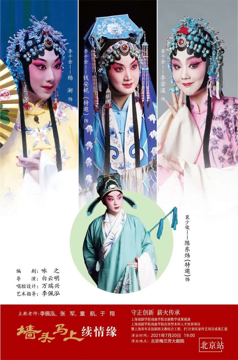 7月20日晩演出的上戏青春版程派新编戏《墙头马上续情缘》作为教学剧目,由在校生李若溪、杨淅与19届毕业生钱安妮、陈东炜等担纲主演,李佩红、张军、童航、于翔等京昆名家名师悉心教导,精心指导学生通过该剧的排演,体验戏曲角色的创造方式和戏曲演出的基本规律,践行京昆艺术“守正创新 薪火传承”的优良传统。