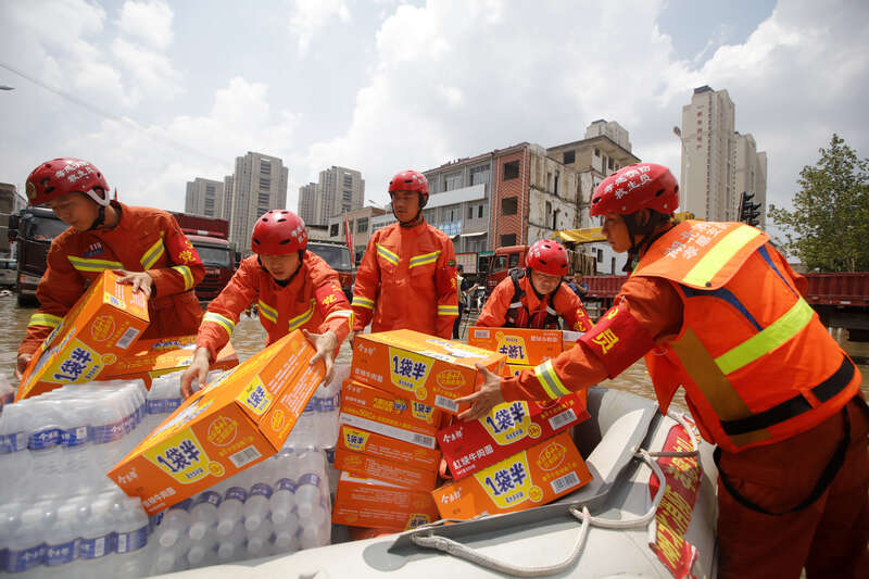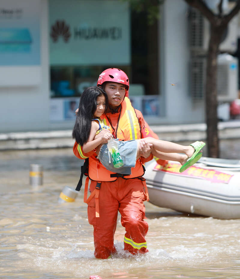 在白沙镇受灾区域,消防救援人员利用橡皮艇一边帮助群众运送急需的生活物资,一边帮助群众出行。7月24日,共为受困群众运送生活物资4余吨,帮助400多名群众解决出行困难。