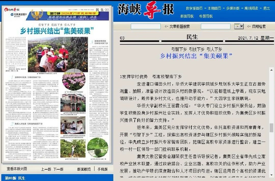 报道称,华大建筑学院学子走进灌口镇田头村古厝旁进行测量、拍照,设计改造田头村的微景观。华侨大学副校长王丽霞介绍:“华大专门设立乡村振兴服务站,鼓励学生积极投身乡村振兴社会实践,发挥人才优势和组织优势,为集美区乡村振兴提供了良好的智力支持。”