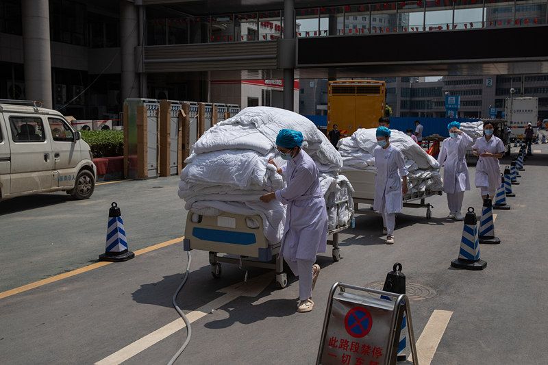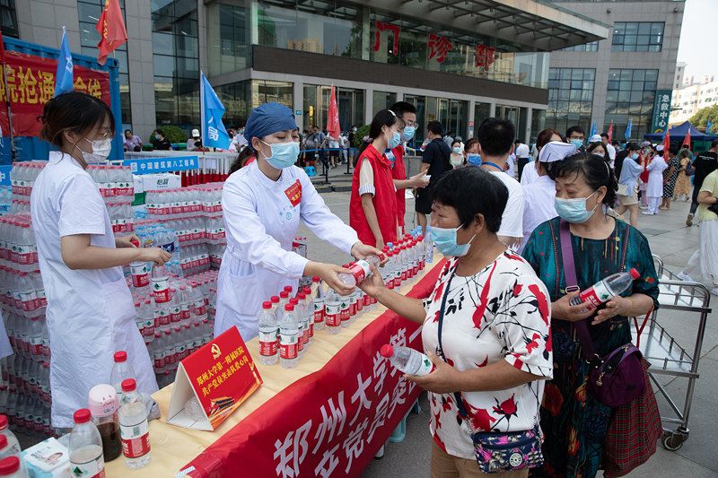 2021年7月26日上午7时,郑州大学第一附属医院河医院区正式恢复接诊。医护人员正在转运医疗物资。
