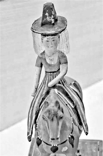 这种装扮有多酷呢?新疆维吾尔自治区博物馆藏有一件唐代彩绘骑马戴帷帽仕女泥俑,只见这位唐代的小姐姐,穿着鲜亮的衣裳,头戴帷帽,英姿飒爽。是的,这种帷帽最早出现在西北少数民族地区,它不仅可以防晒,还可以防风沙,是西域小姐姐的出行必备穿搭。后来,在南北朝时期传入了中原,到了唐初尤为盛行,成为了大唐出行时尚单品TOP10!据《旧唐书·舆服志》记载:“初妇人施幂篱以身,自永徽中始用帷帽,施裙及颈。武后时帷帽益胜,中宗后乃无复幂篱矣……开元初,从驾官人骑马者,皆著胡帽,靓妆露面,无复障蔽。士庶之家,又相效仿……至露驰骋而帷帽亦废。”