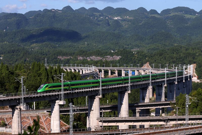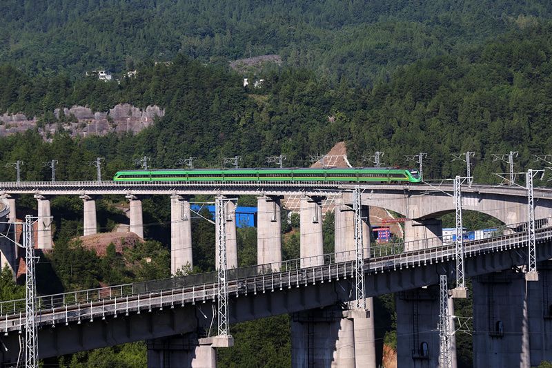2021年7月25日,由四川成都东开往湖南张家界的“复兴号”动车组列车行驶在黔张常铁路重庆市黔江区铁炉堡大桥上。
