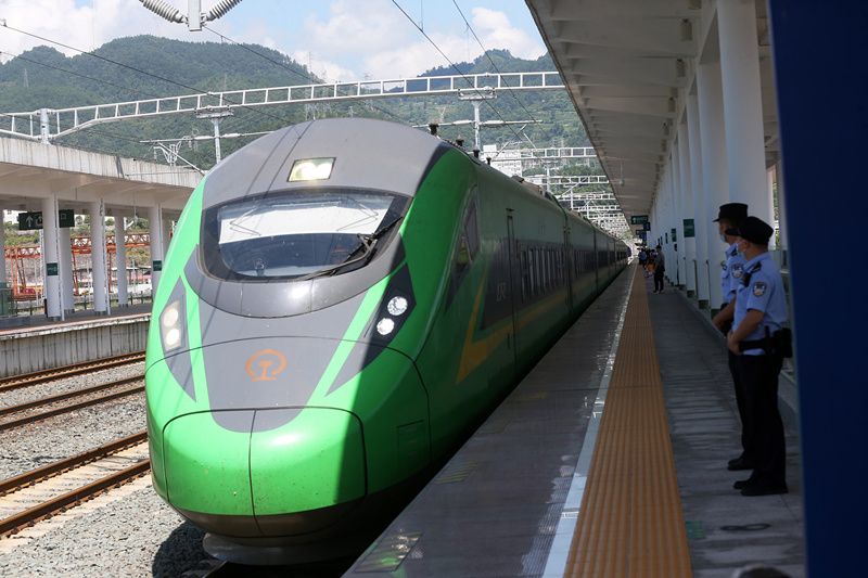 2021年7月25日,由四川成都东开往湖南张家界的“复兴号”动车组列车停在重庆市黔江区火车站。