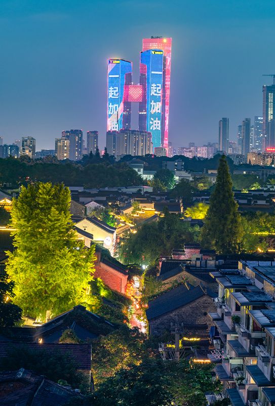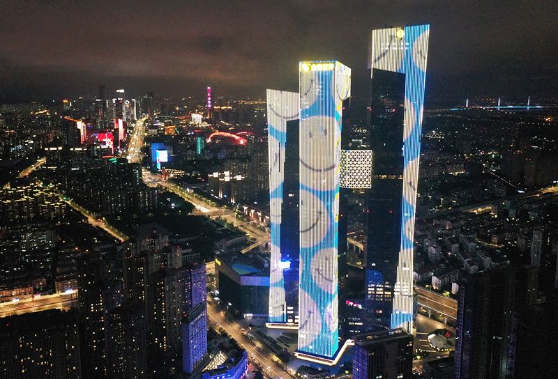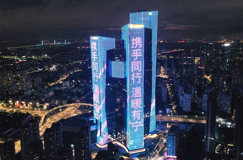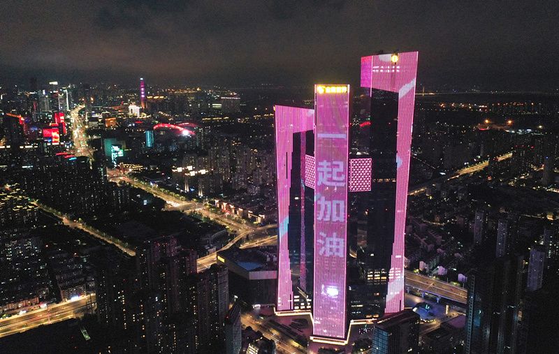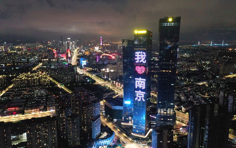 2021年7月28日晚,位于南京市建邺区的高楼外立面点亮“一起加油”“携手同行 温暖有宁”“我爱南京”等标语字样和卡通笑脸。