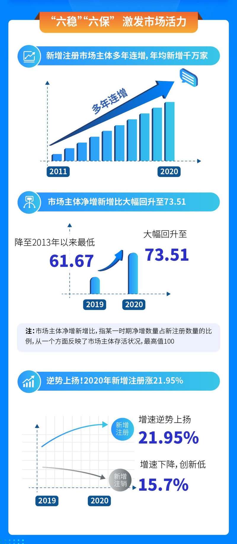 中国青年报客户端讯(中青报·中青网记者 宋宝颖)日前,商务部研究院信用研究所联合天眼查发布的《中国市场主体发展活力研究报告(2011-2020)》显示,2013年以来,年均新增市场主体总量超过千万家,2020年我国新增注册市场主体仍呈现逆势增长势头,全年新增市场主体近2360万家,同比增速达21.95%。
