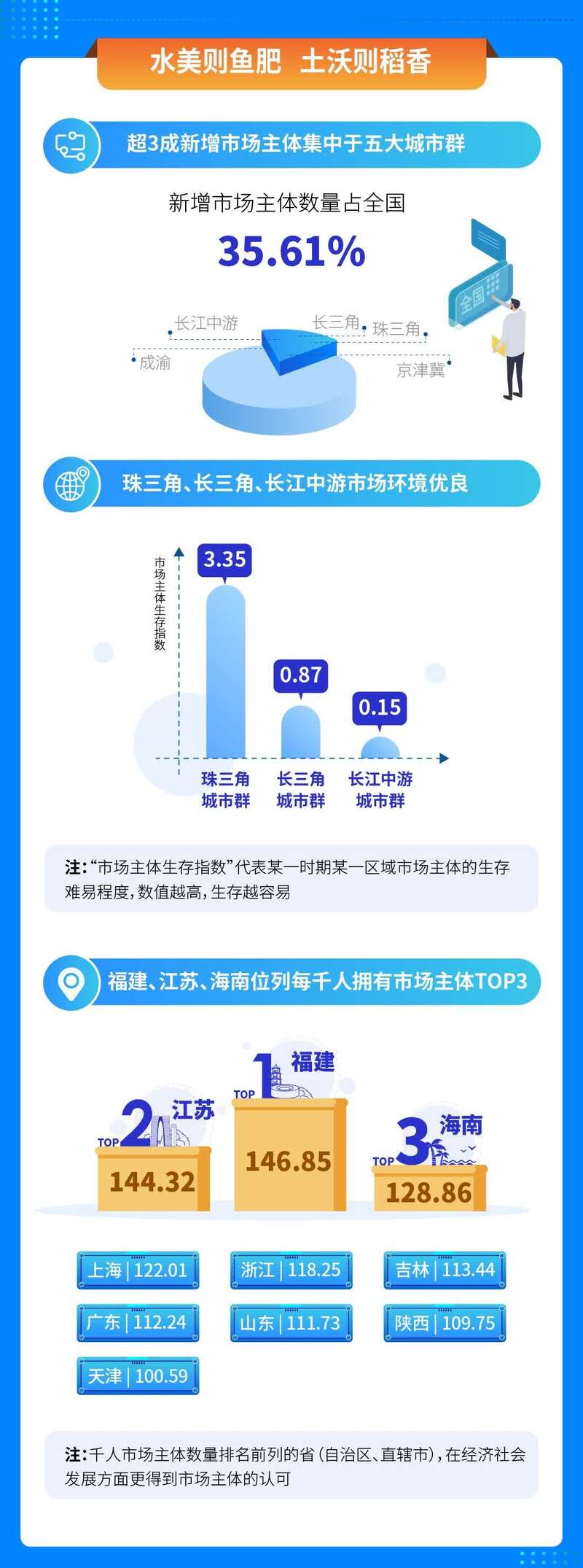 据了解,《中国市场主体发展活力研究报告(2011-2020)》按照区域划分统计了2011年以来新增市场主体数量。长三角、珠三角、京津冀、长江中游和成渝五大城市群新增市场主体数量总计占全国的35.61%,超三成新增市场主体集中于五大城市群。在各类市场主体中,小微市场主体和民营企业整体活跃度较高,个体工商户和有限责任公司涨幅最高。从市场主体注册资金规模分布情况看,2011-2020年,注册资金规模在0-100万元的新注册主体数量占到全部新注册主体数量的95.78%。这说明,“放管服”改革等系列改革措施极大地促进了小微市场主体的发展,这些新增的经济活动参与者释放出强大活力,为推动我国经济高质量发展奠定了基础支撑作用。