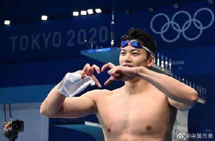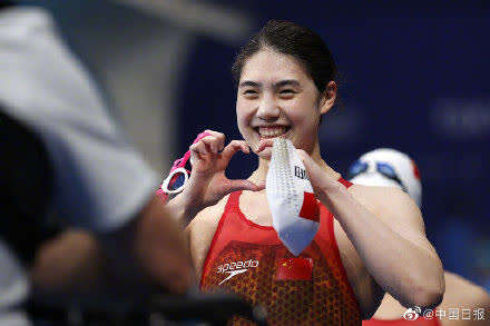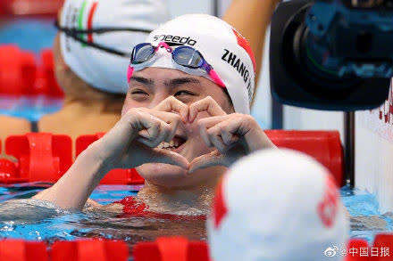 23岁张雨霏夺冠打破奥运纪录,出水后对镜头比心。