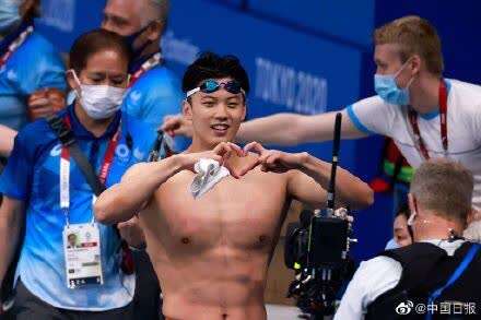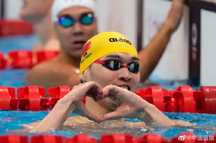 中国游泳远动员徐嘉余出水后对镜头比心。