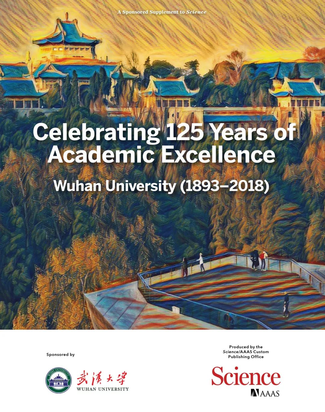 而在武大125周年校庆时,《Science》为武大推出了一期专刊,封面便是彭敏拍摄的武大图片,测绘学院的赵望宇同学用AI将它转化成了油画风格,实现了武大文化与新兴科技的交融,这也是我们身边的人工智能技术。