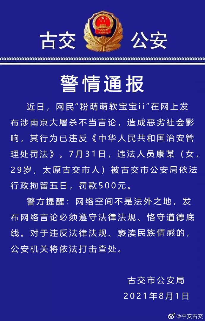 据@平安古交消息,近日,网民“粉萌萌软宝宝ii”在网上发布涉南京大屠杀不当言论,造成恶劣社会影响,其行为已违反《中华人民共和国治安管理处罚法》。7月31日,违法人员康某(女,29岁,太原古交市人)被古交市公安局依法行政拘留五日,罚款500元。