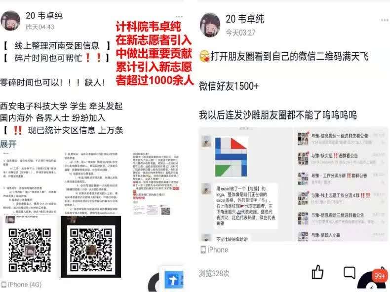 “我是西安电子科技大学电子信息工程专业的本科生,我可以熟练地整理各种表格和其它文档,也可以用编程工具实现求助信息可视化,如果需要,我可以发动更多的同学加入我们!”7月21日上午,罗宏亮加入到“与豫”志愿者团队,并通过QQ空间和微信朋友圈发布倡议,希望更多的西电学子可以加入到河南汛情志愿服务工作中。