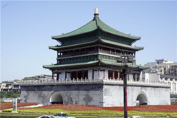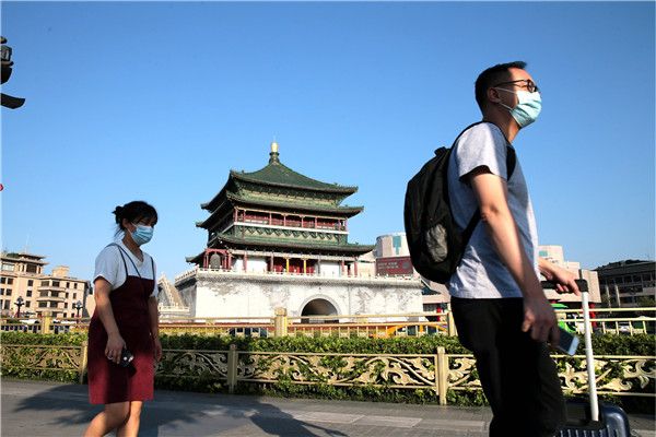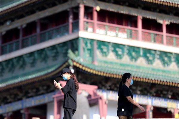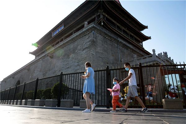 2021年8月1日,陕西西安,市民从鼓楼外经过。陕西省7月30日起全面收紧社会管控措施,坚决防止疫情反弹,西安市秦始皇帝陵博物院、钟鼓楼博物馆、华清宫景区暂停开放,大雁塔北广场暂停喷泉表演。
