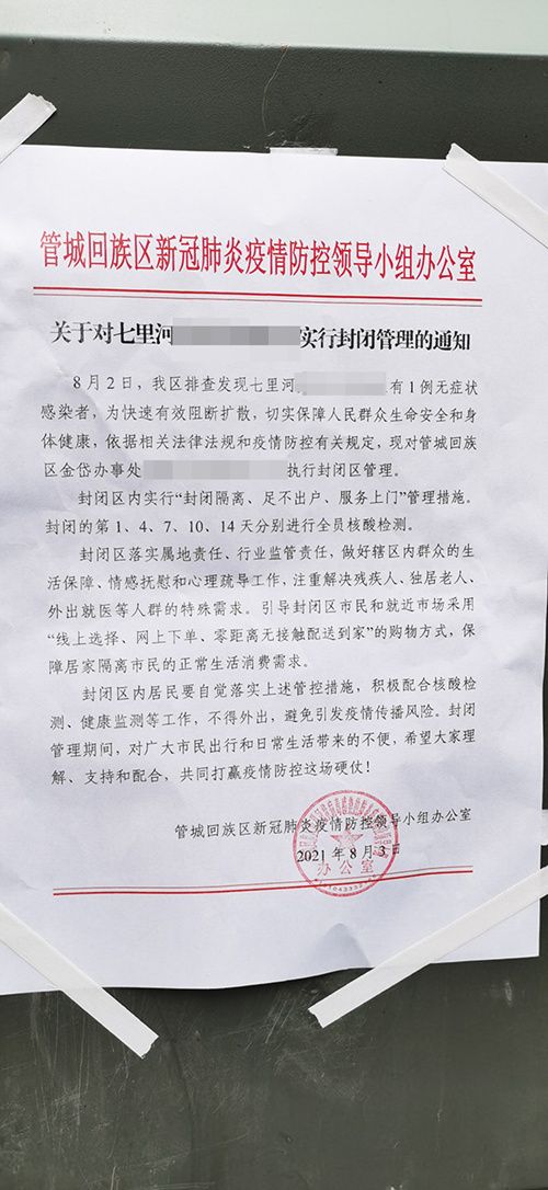 昨晚,我们小区还没见正式封闭管理的文件,我感觉应该是街道办为安全考虑,先管控起来。今天(8月3日),我们小区,还有这名无症状感染者工作的那个小区,都被管城区疫情防控领导小组办公室下了正式封闭管理的通知,实行“封闭隔离、足不出户、服务上门”管理措施,封闭的第1、4、7、10、14天分别进行全员核酸检测。