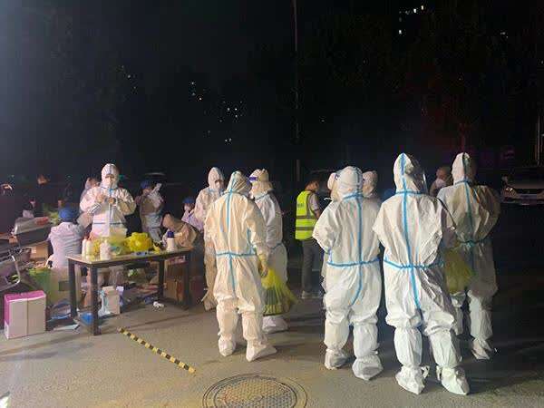 8月2日晚,小区内全套防护服的工作人员。对28岁的郑州居民张小花(化名)来说,疫情从来没离自己这么近过。8月2日晚7点,她下班回到小区,被守在门口的街道办工作人员告知:小区发现一名确诊病例(编者注:实际是无症状感染者),只进不出。