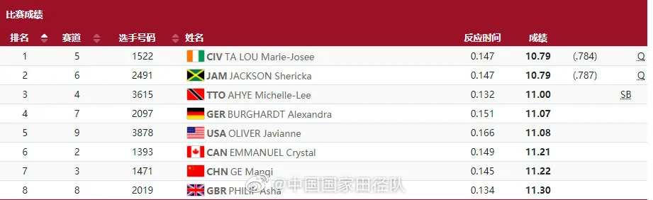 最后冲刺,塔劳和杰克逊几乎同时撞线,两人的成绩同为10秒79。阿赫耶以11秒00拿到小组第三,葛曼棋以11秒22排在第7名。