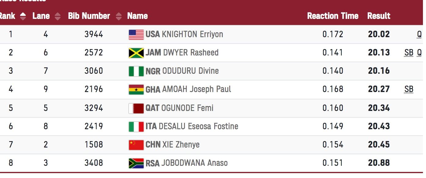 由于腿伤反复,此前100米预赛中,谢震业以10秒16的成绩排名小组第五无缘半决赛,赛后,他透露,这一枪更多是为了测试身体状况,为200米比赛做准备。而他今天在200米赛道上的表现,也证明他在中国田径200米领跑者的地位。