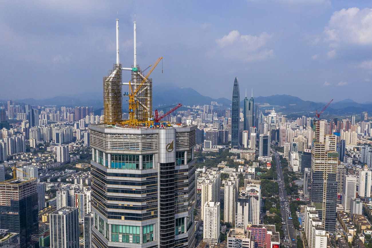 2021年8月2日,深圳华强北的赛格广场大厦楼顶桅杆拆除施工正在进行中。