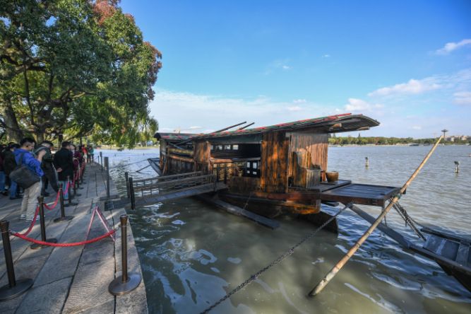 △停靠在浙江嘉兴南湖湖心岛的南湖红船(2020年10月27日摄)。新华社记者 徐昱 摄