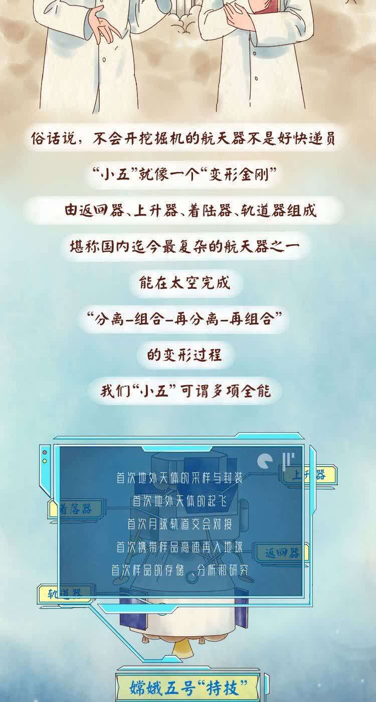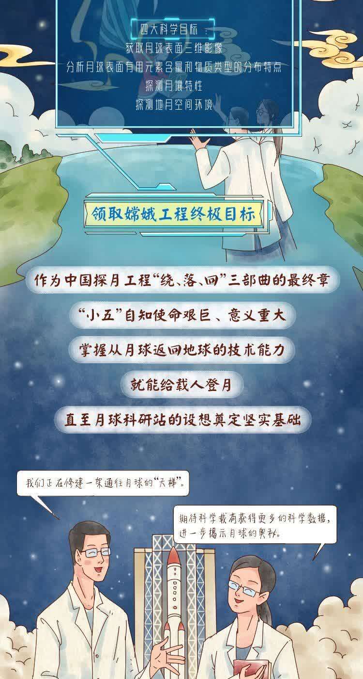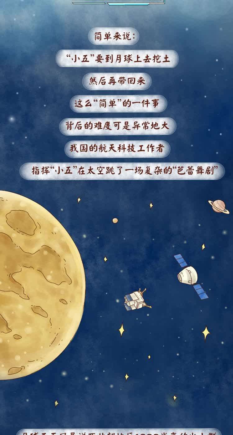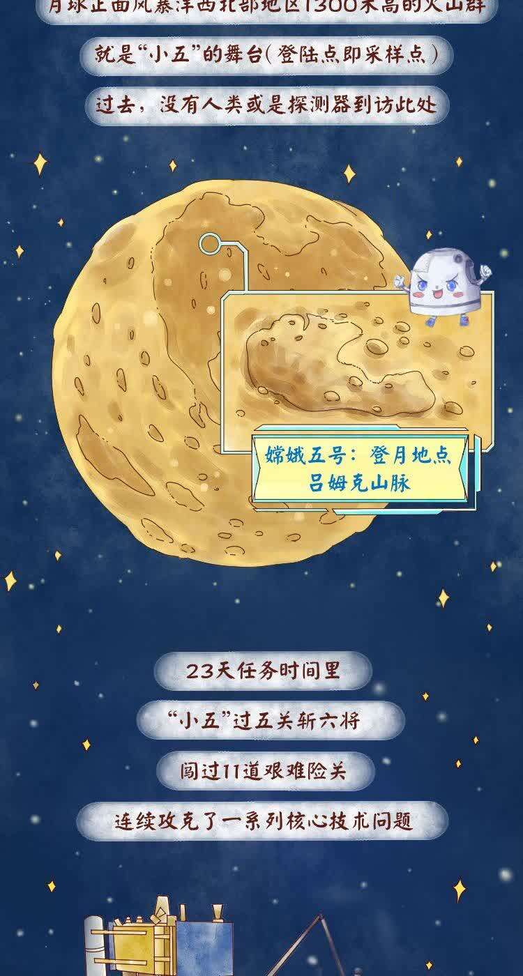 2020年12月17日凌晨1时59分,嫦娥五号返回器携带月球样品在内蒙古四子王旗预定区域安全着陆,标志着我国首次地外天体采样返回任务圆满完成,实现探月工程三步走的最后一步——“回”。